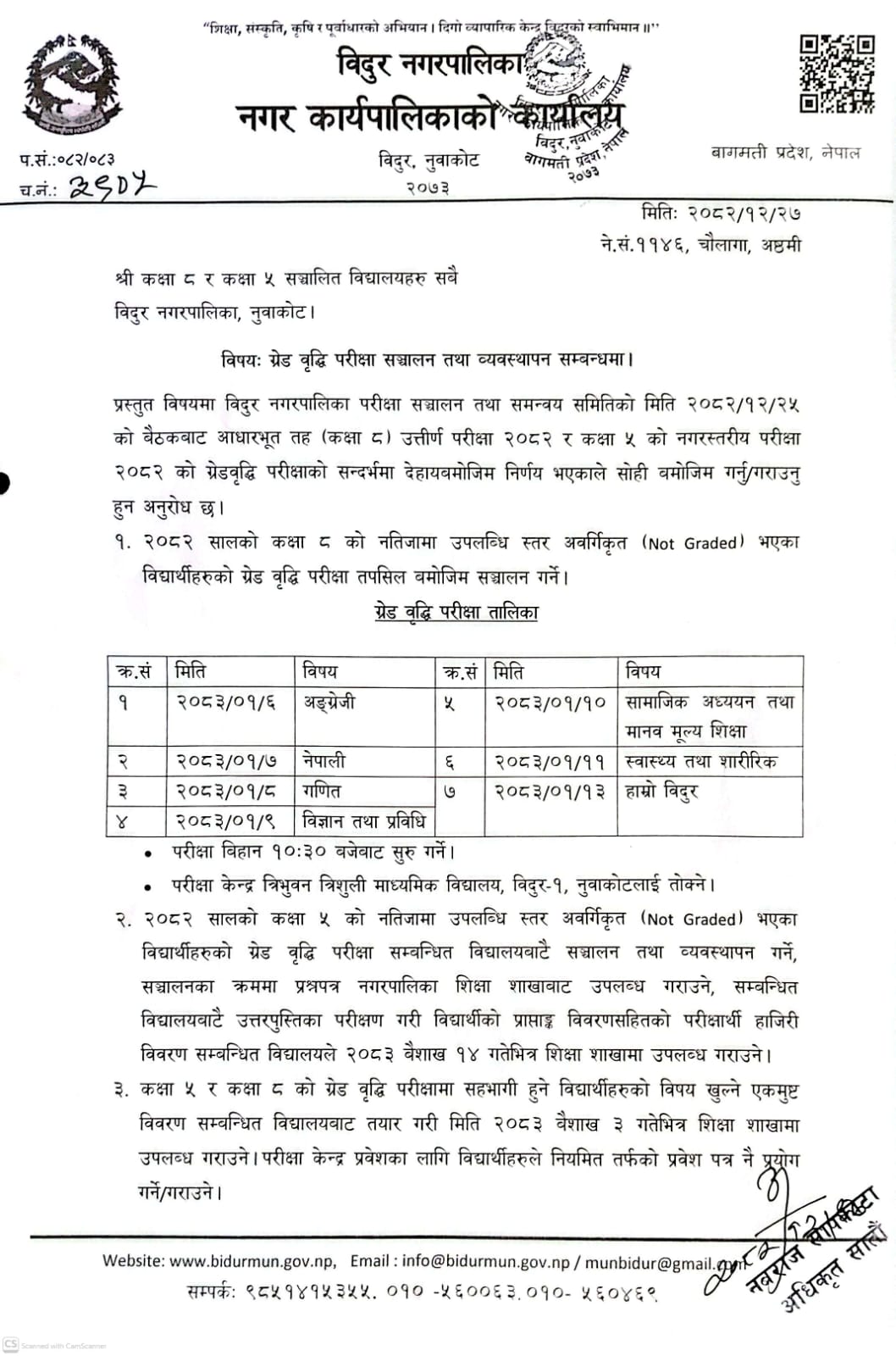 ग्रेड वृद्वि परीक्षा संचालन तथा व्यवस्थापन सम्बन्धमा ।