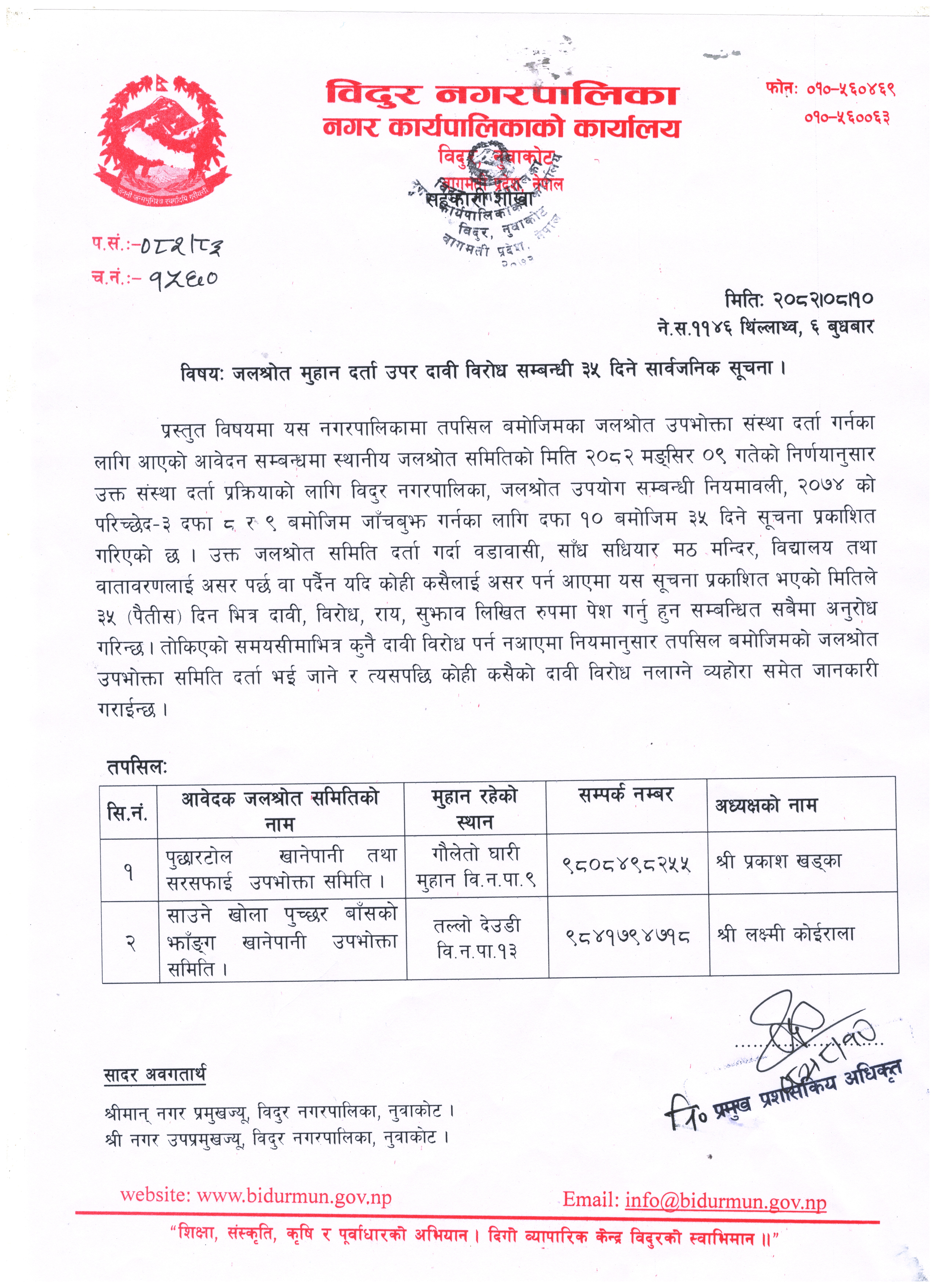 जलश्रोत मुहान दर्ता उपर दावी बिरोध सम्बन्धी ३५ दिने सार्वजनिक सूचना ।