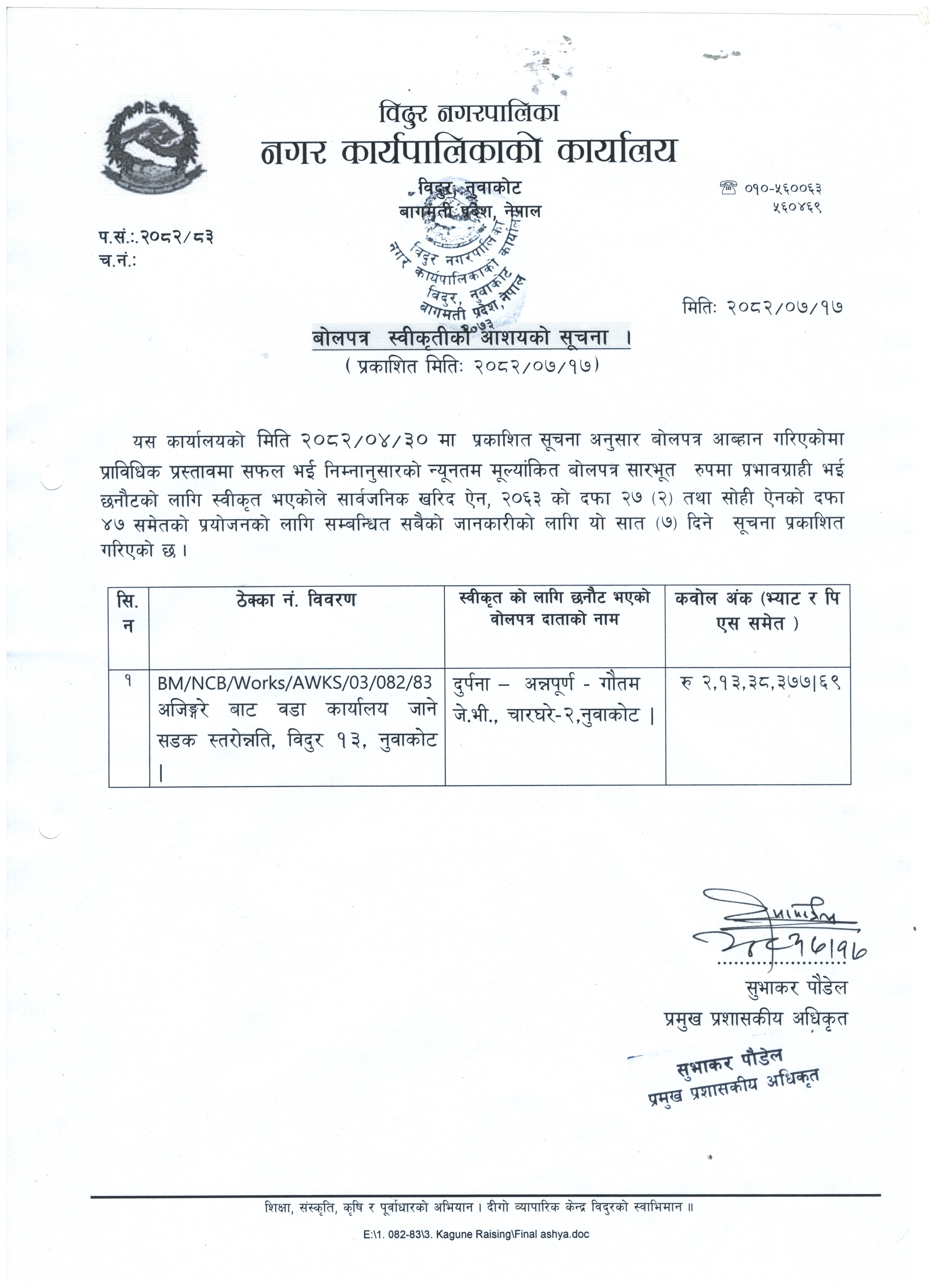 बोलपत्र स्वीकृतीको आशयको सूचना ।