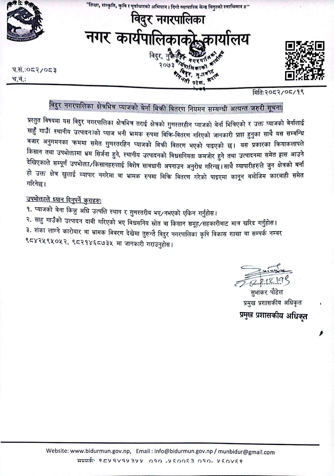 विदुर नगरपालिका क्षेत्रभित्र प्याजको बेर्ना बिक्री वितरण नियमन सम्बन्धी अत्यन्त जरुरी सूचना।