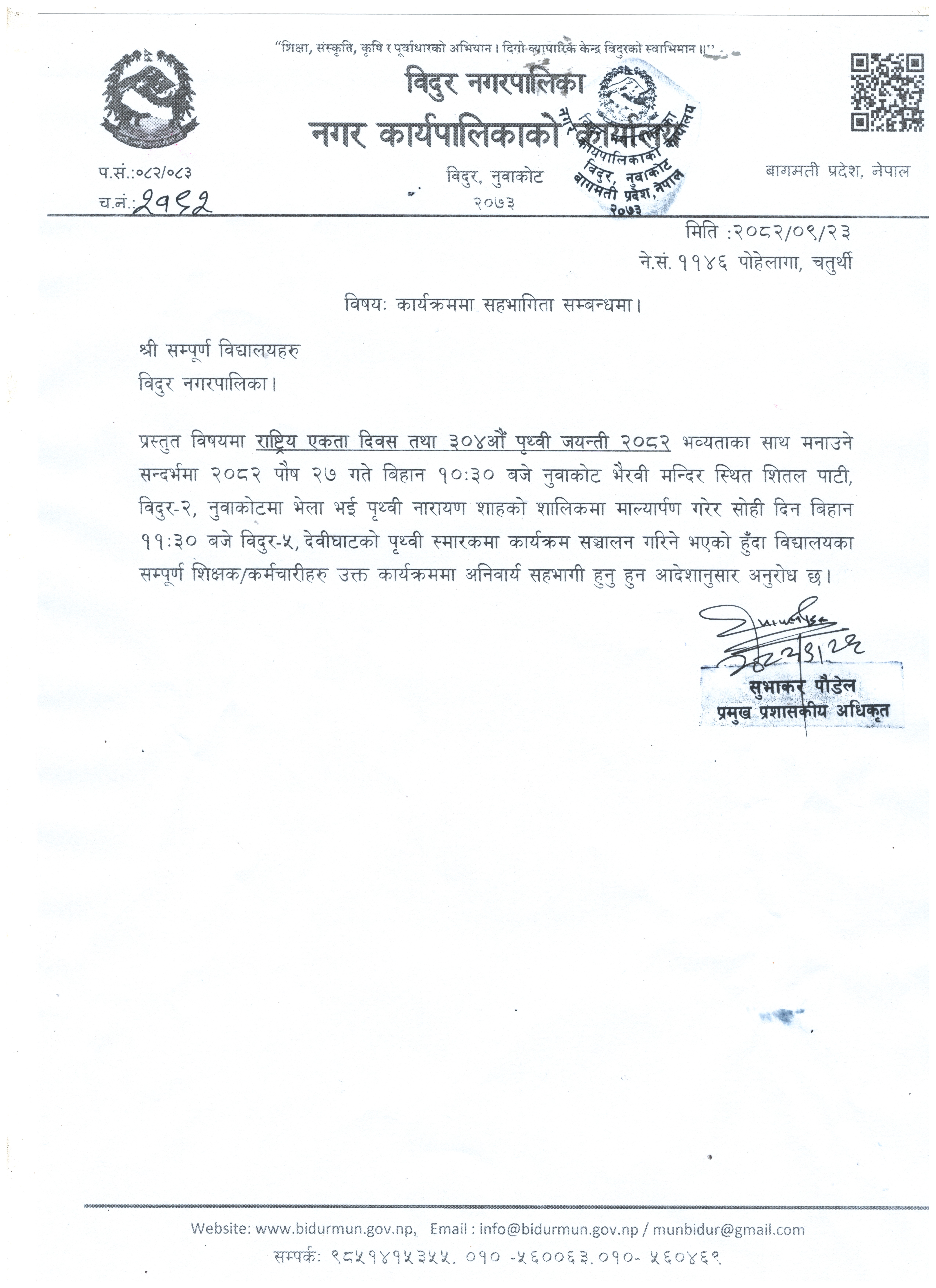 सम्पूर्ण विद्यालयहरु कार्यक्रममा सहभागिता हुने सम्बन्धमा ।